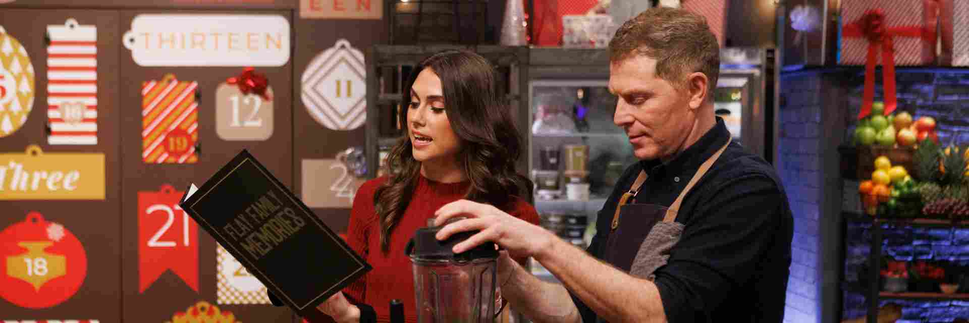 Co-host Sophie Flay shows Bobby Flay a family photo album as he cooks during round three, as seen on Beat Bobby Flay Holiday Throwdown, Season 2.
