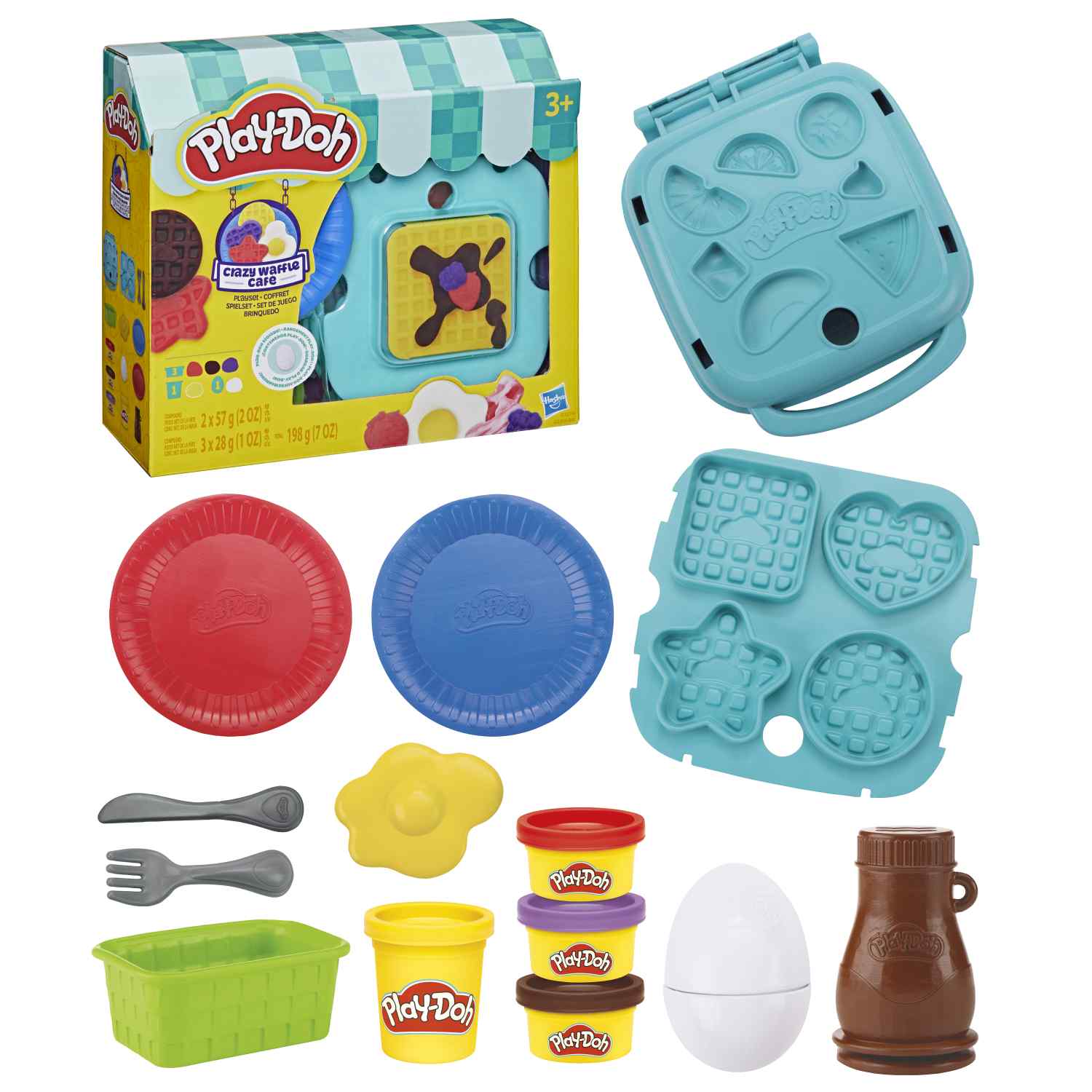 (HASBRO | Ages 3 years & up | Available at most major retailers starting 7/15/26)Have make-believe breakfast anytime with the Crazy Waffle Cafe Playset! This Play-Doh set has everything pretend chefs need for their next kitchen toy adventures. The waffle maker has a mold plate inside to make 5 different shapes, plus stamps on the bottom to make fun pretend toppings. Complete the creations with Play-Doh accessories like an egg stamper, pretend syrup bottle, and berry basket. Includes 4 colorful Play-Doh cans and an egg-shaped storage container for sensory play. Get imaginations cooking with a toy gift for all occasions like Christmas, holidays, non-candy Easter basket stuffers, or birthday gifts for girls and boys 3 years and up.